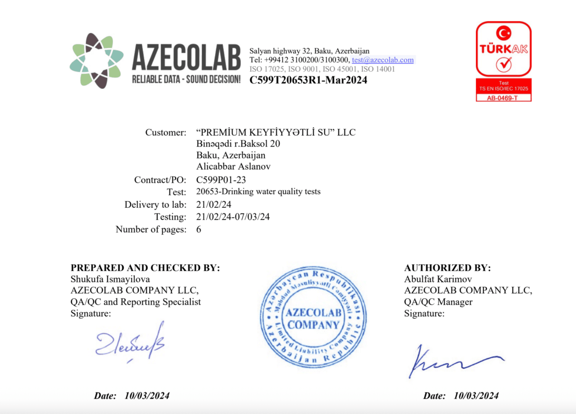 Bu məqsədlə, su nümunələri mütəmadi olaraq akkreditə olunmuş laboratoriyalarda yoxlanılır. Yoxlamalar nəticəsində suyun tərkibi, kimyəvi, bioloji, sanitar-epidemioloji normalara və dövlət standartlarına tam uyğunluğu təsdiqlənmişdir. Bu da müştərilərimizə təqdim etdiyimiz suyun premium keyfiyyətli olduğunu göstərir.